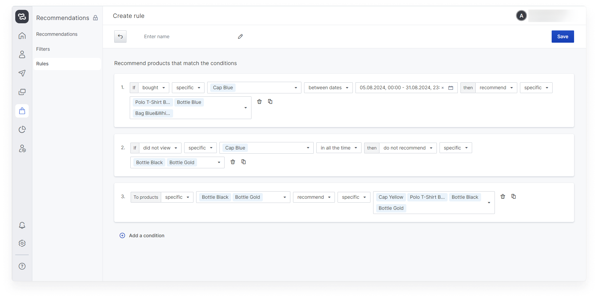In each recommendation block you can use up to 5 rules, each of which can consist of a maximum of 10 conditions. That is, a maximum of 50 conditions can be applied in one block. The same rule can be used in different recommendation blocks (if you change it, it will change in all blocks).
