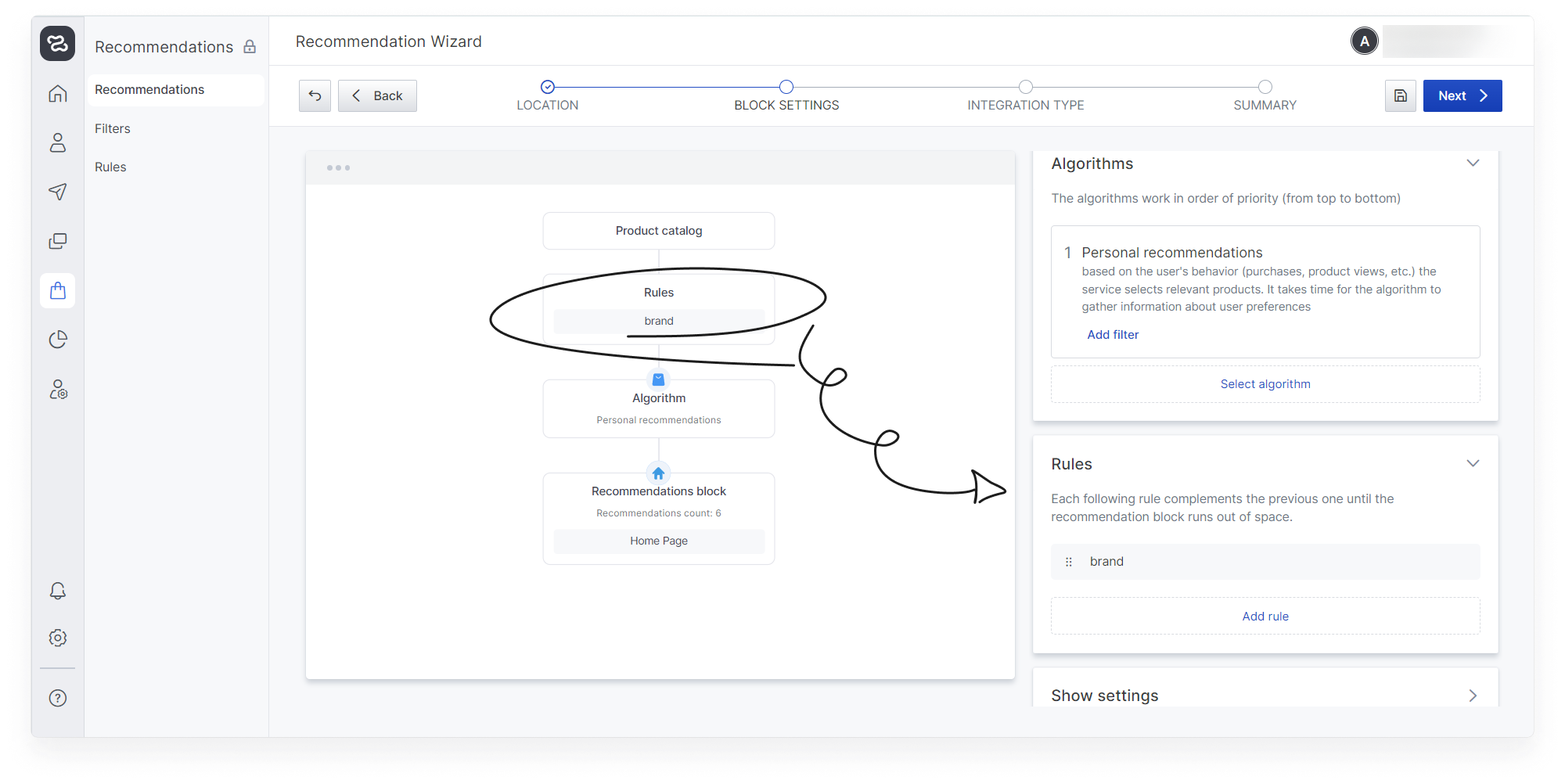 Rules are a kind of segments for products based on their parameters or on the behaviour of users who interact with the products. In the hierarchy of the recommendation service, rules are in the first place (Product Catalogue - Rules - Algorithm - Filters). Thus, if you add a rule, an algorithm and a filter to the recommendation block, the rule will be triggered first, and if there is space left in the recommendation block, it will be filled with products from the algorithm output, filtered by the selected filter.