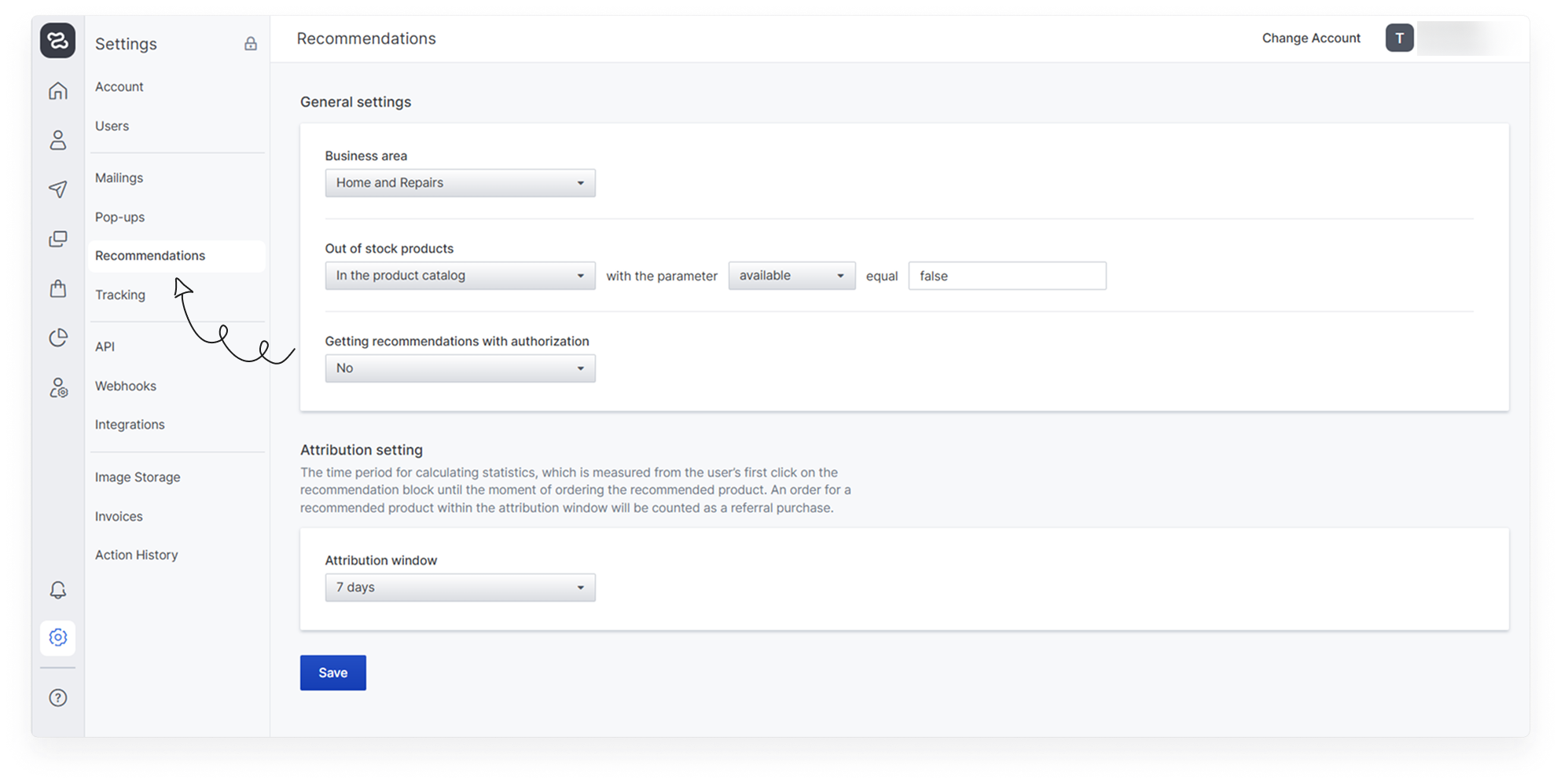 - Setting up attribution (time attribution) - here you can specify the time period within which the order of the recommended product will be counted as a purchase from recommendations