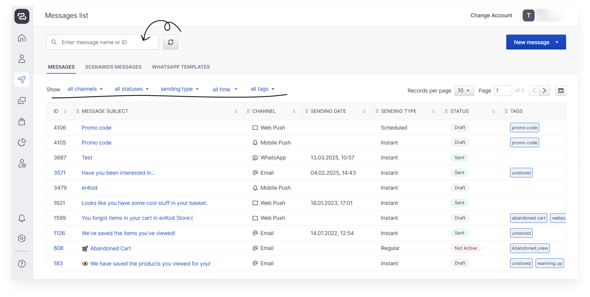 On this page you can view a list of existing messages and create a new one, as well as find a message through a quick search, including tagging. Messages can be sorted by ID or by type and filtering can be used