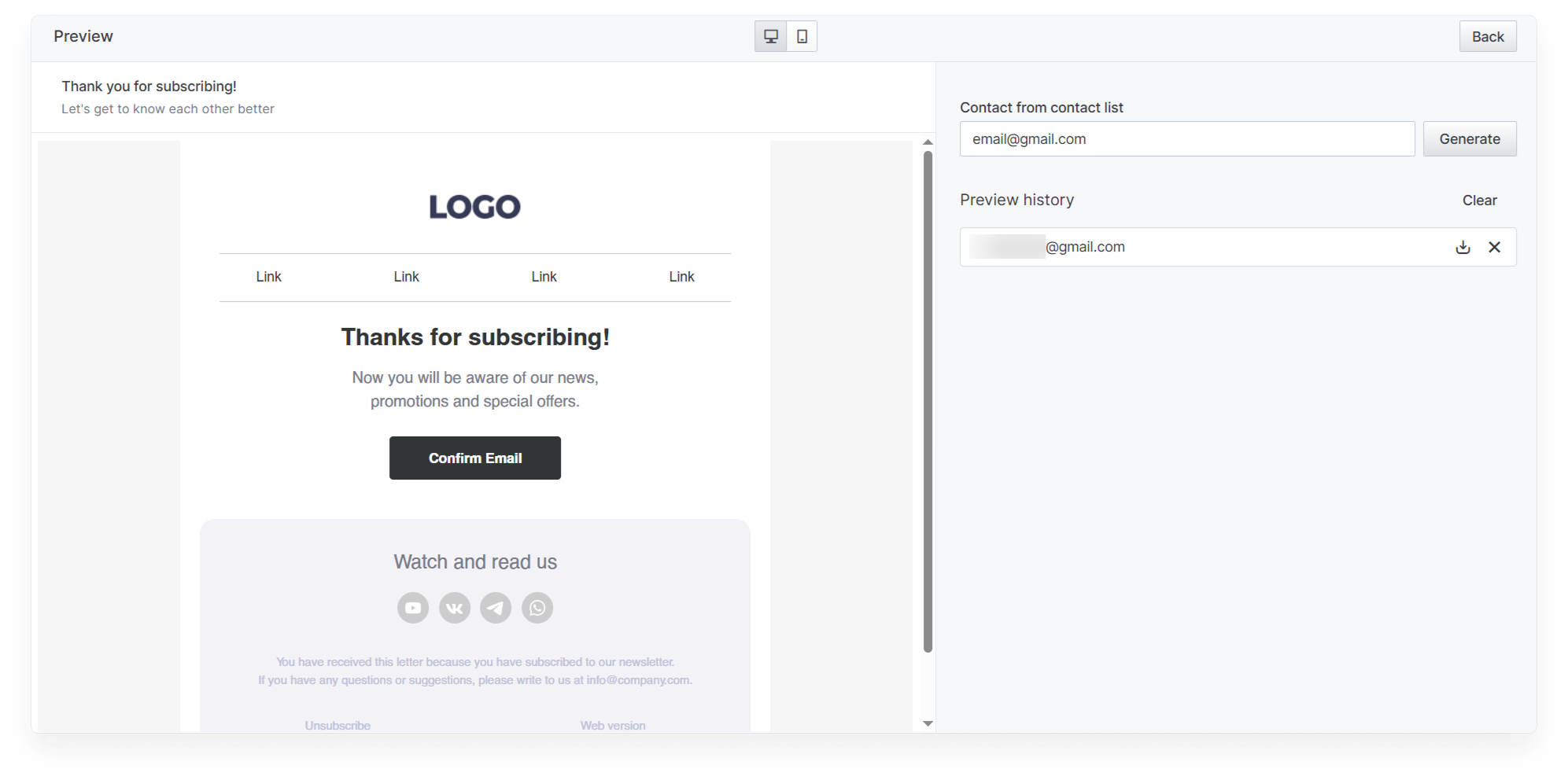 In the message creation wizard and preview, you can check the message display on desktop and mobile devices for the most common display sizes: