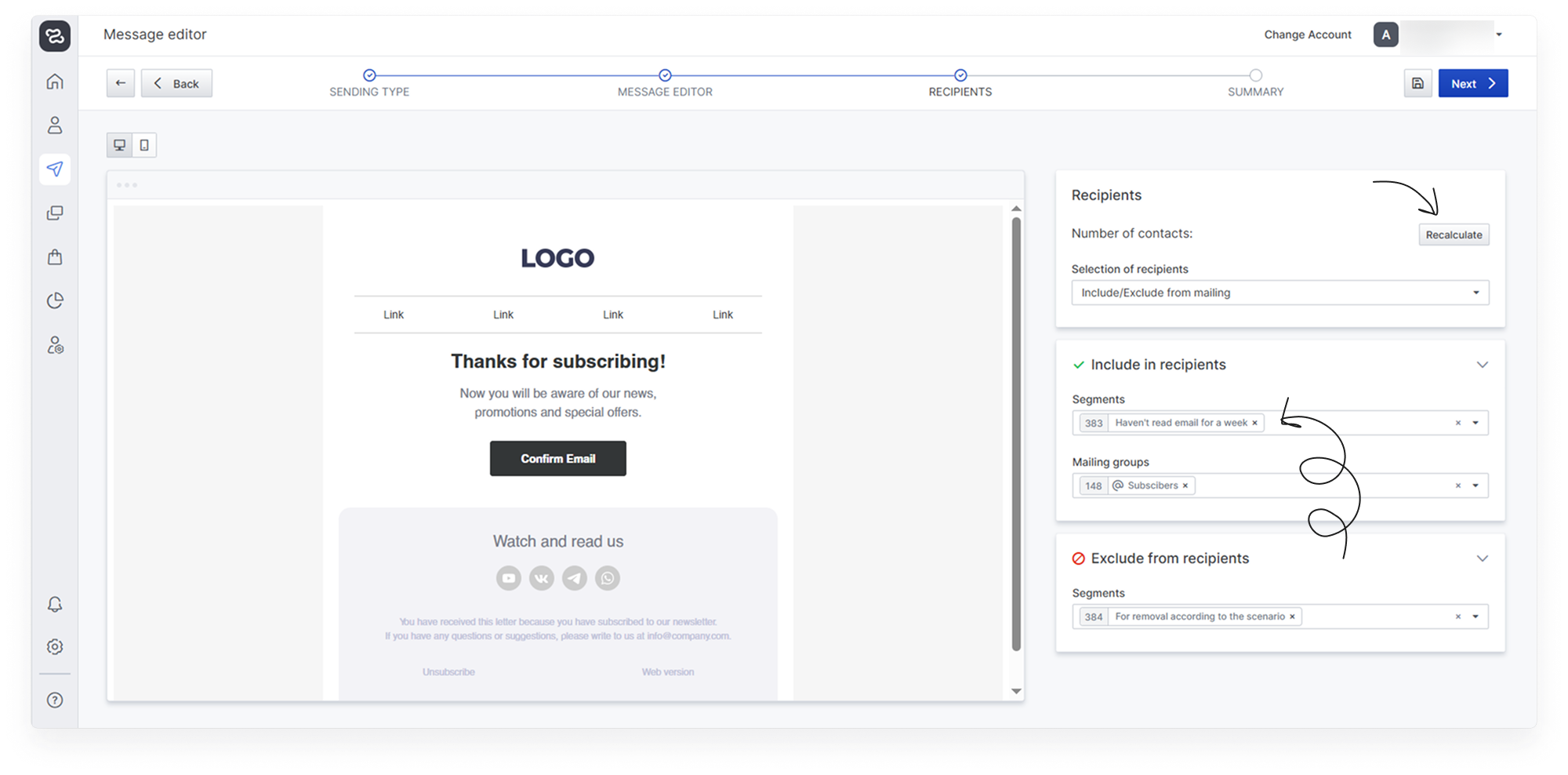 When sending to a mailing group and a segment at the same time, recipients are added up, but only unique contacts without duplication will be selected when recalculating and sending (if a recipient is in both a group and a segment - 1 contact will be found during recalculation and 1 message will be sent to him).
