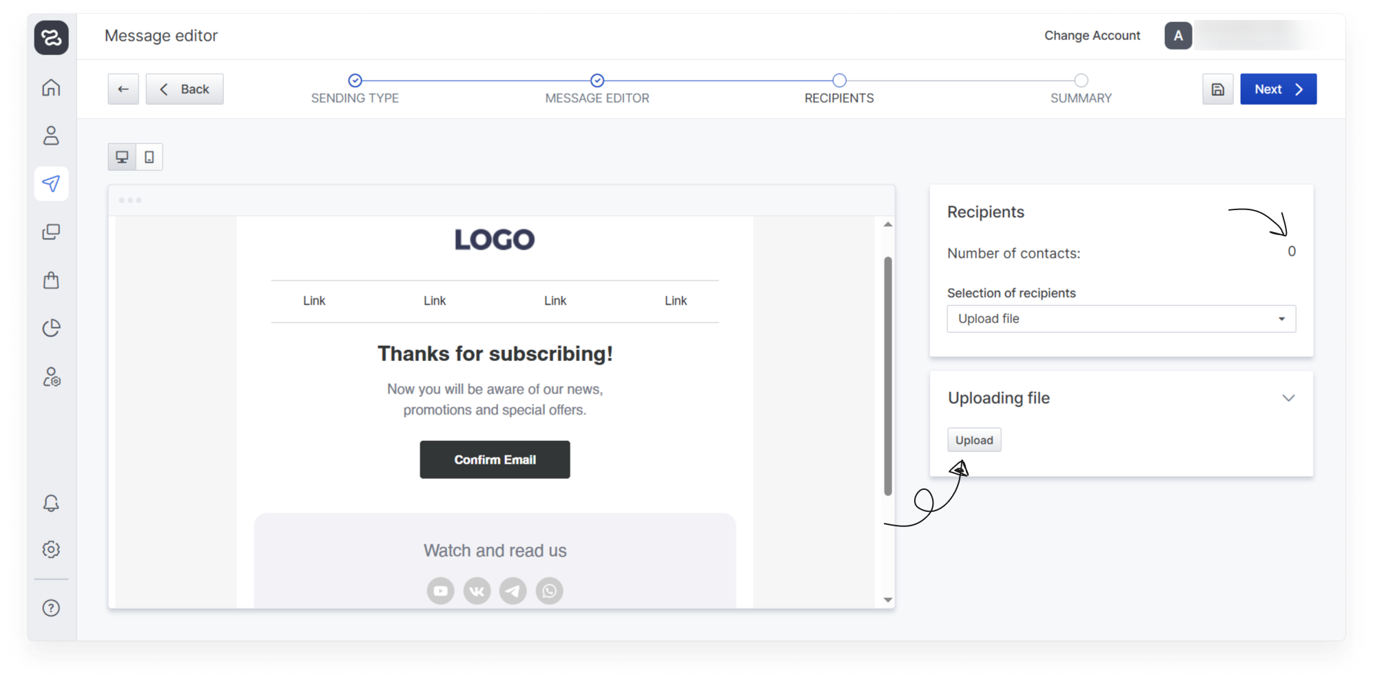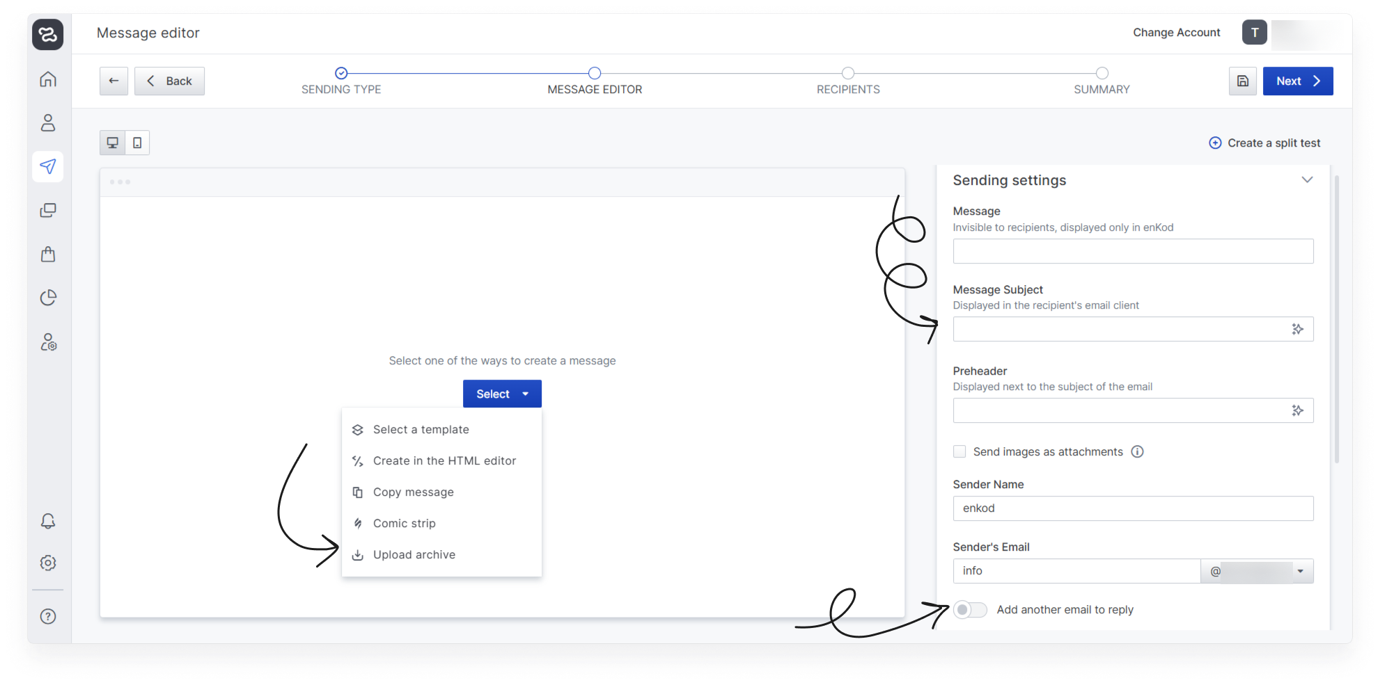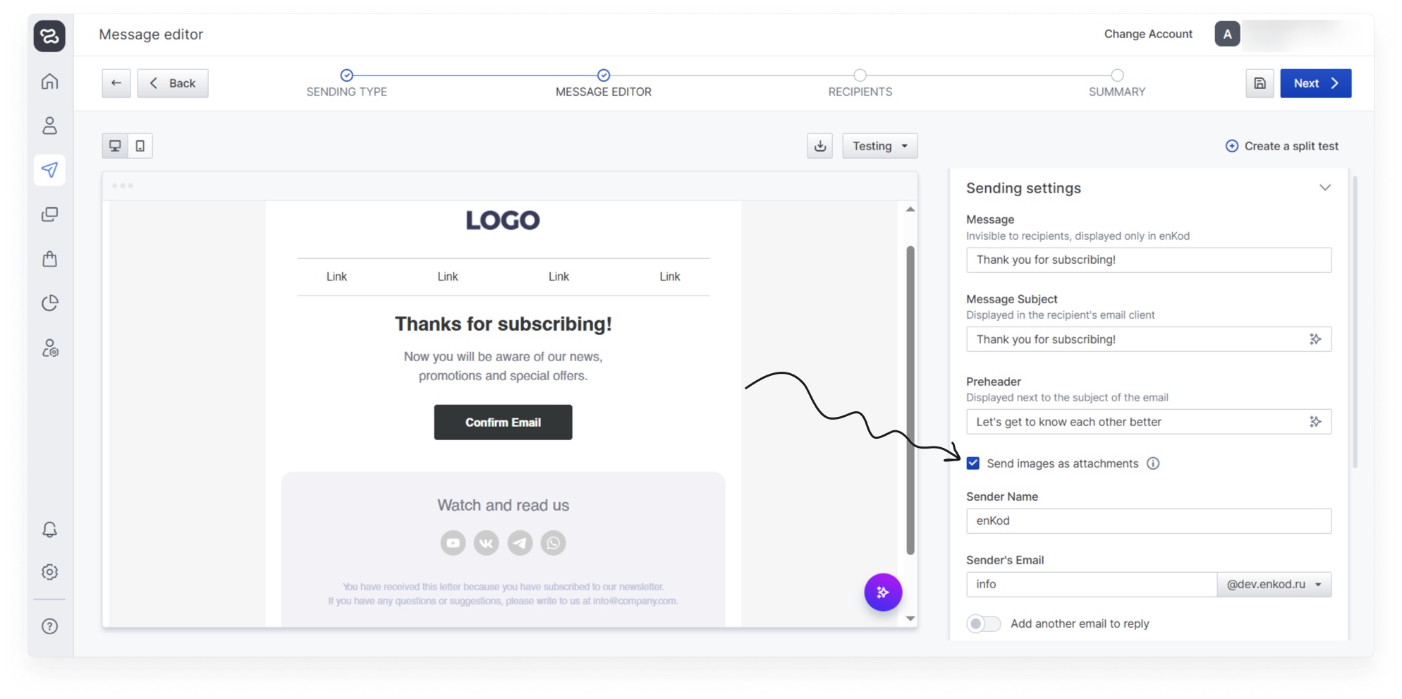 All steps of the email message creation wizard are described below, as well as all settings and parameters you need to know to create an email message in the service.