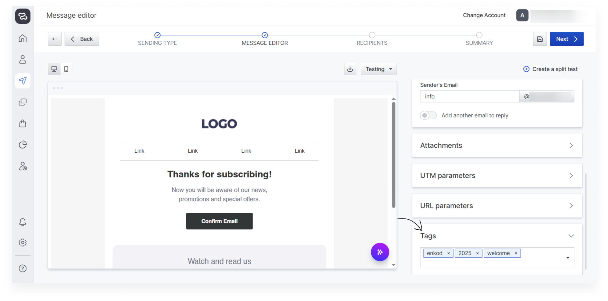 Depending on the Email message's sending type (only available for instant with inactive optimal time, scheduled ones), you can conduct split-testing, each version of the message is edited separately in the “Message Editor” step.