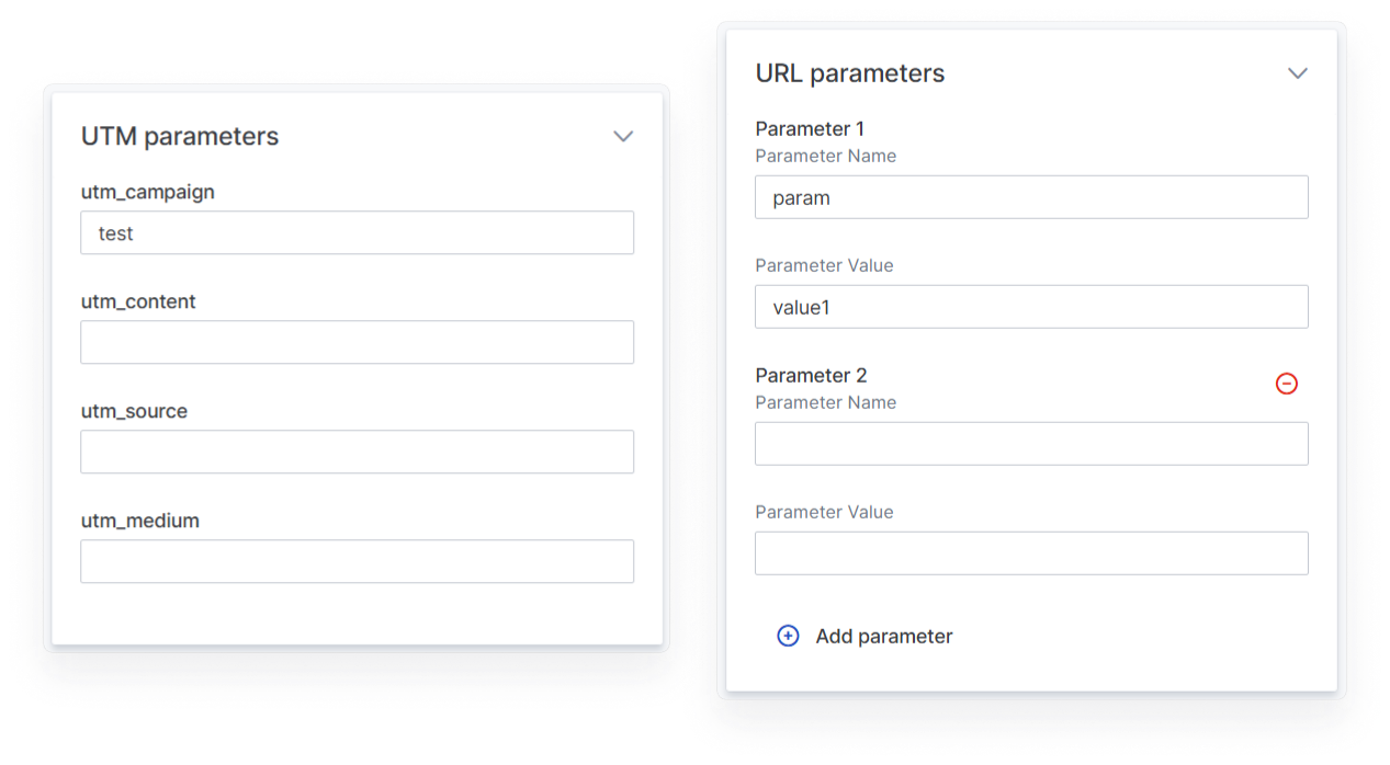 If you want to add dynamic variables to links, use URL parameters. To do this, specify a parameter name and value - these will be assigned to all links in the message. If you plan to use several parameters, click on the “Add Parameter” button - you can create up to 10 parameters at a time. To delete a parameter, click on the bin icon to the right of it.