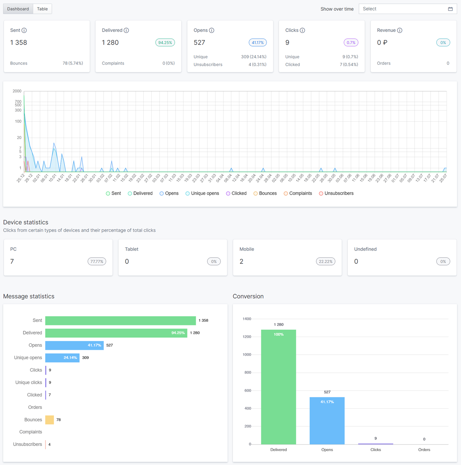 - Unsubscribed - the number of contacts who have currently received the message and unsubscribed from the mailing list.