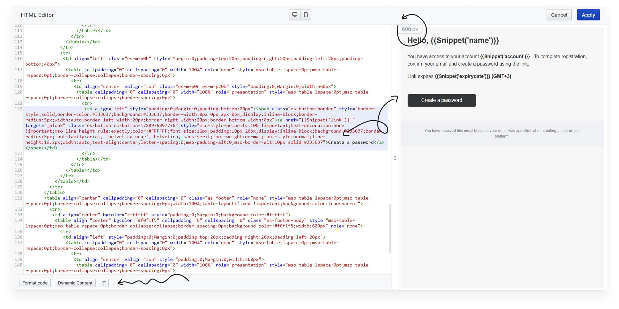 Use the dynamic content manager to add methods or variables to the layout. The email code can be moved word by word for easy editing using the corresponding button at the bottom of the screen.