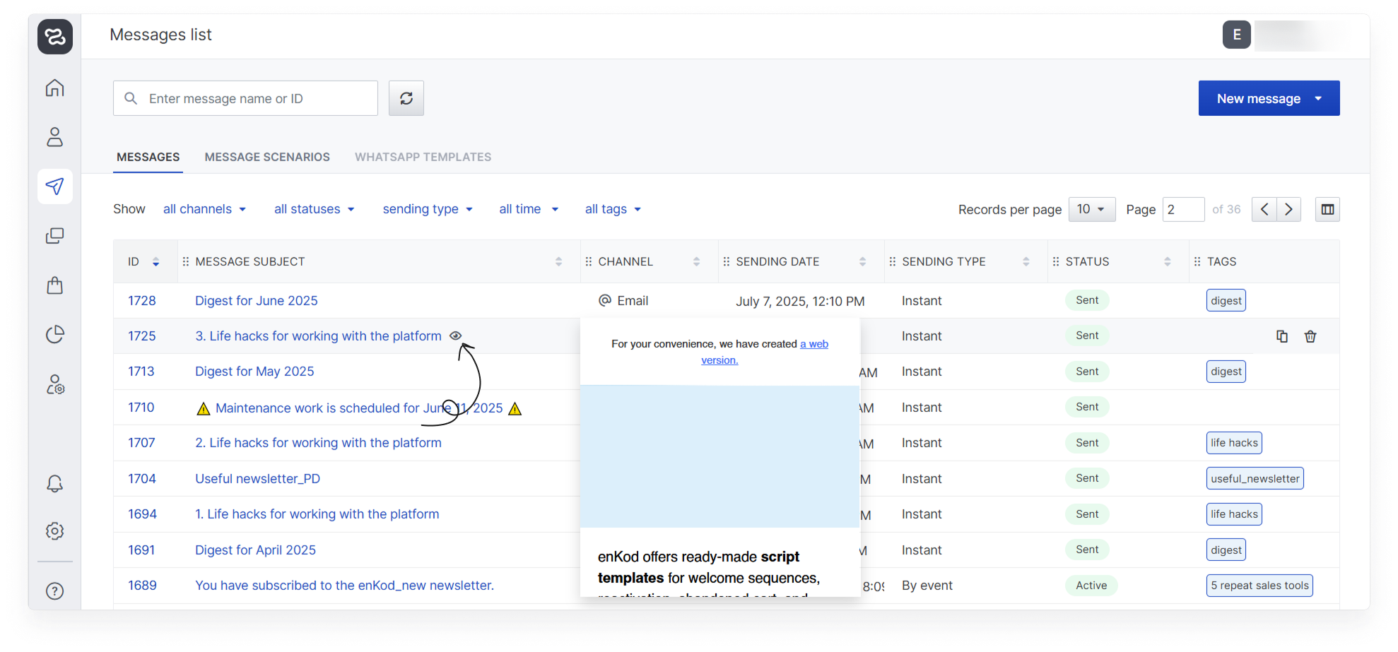 From the list, you can view a preview of the message: to do this, hover over the eye icon (a version A will be displayed for the A/B test).