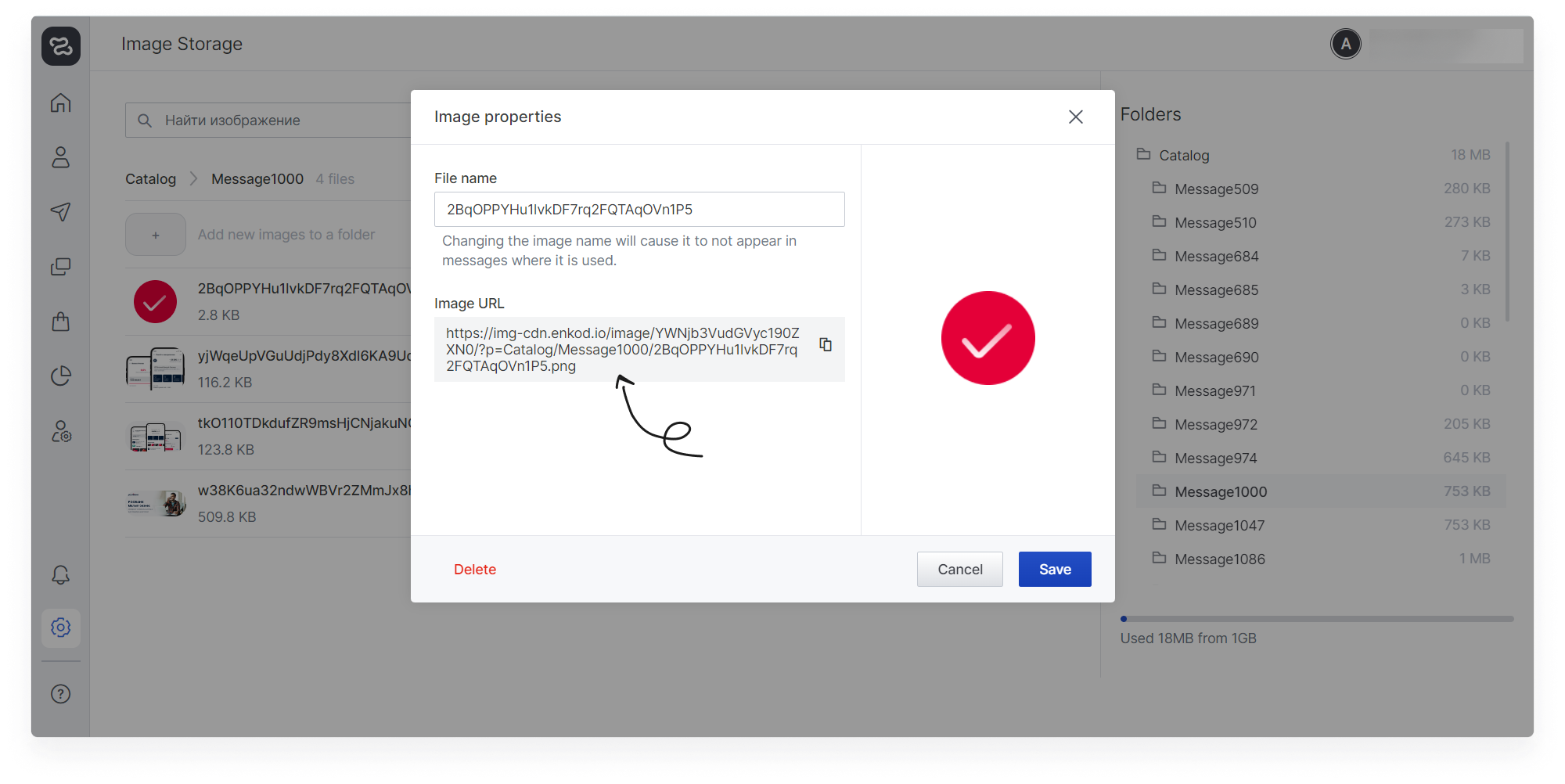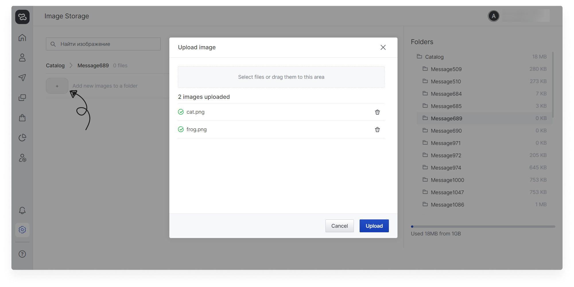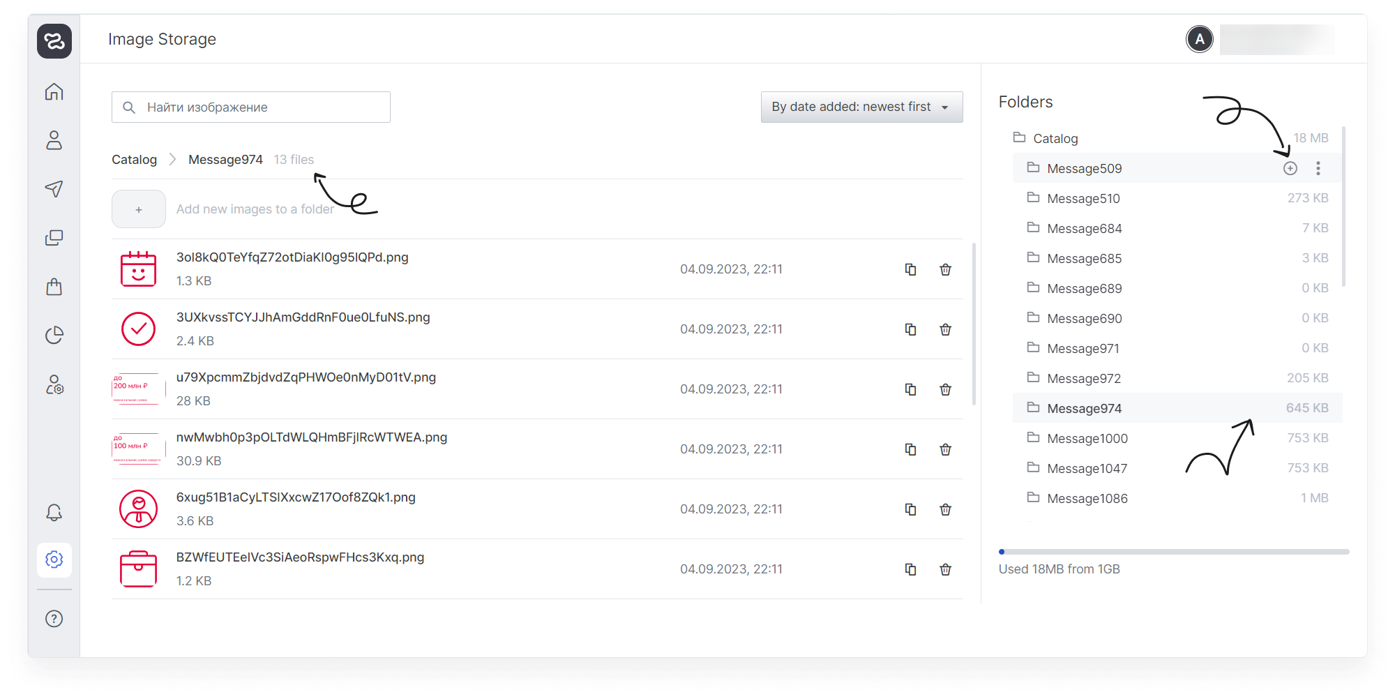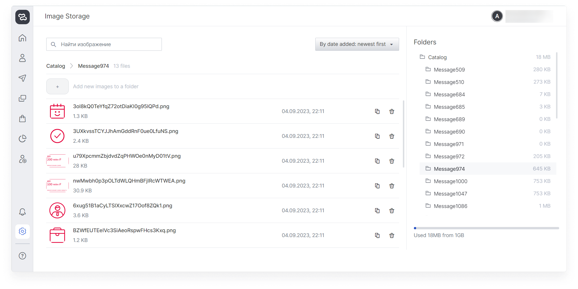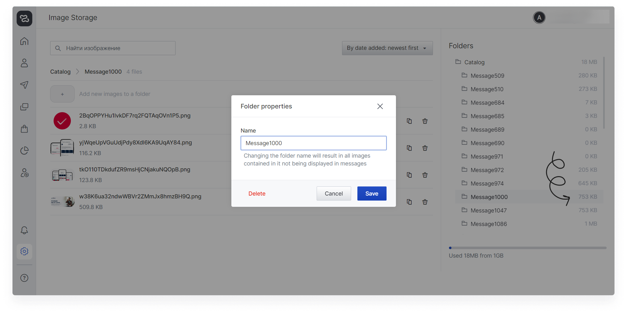 On the free plan, 1GB is available for uploading images. You can delete folders with images from messages that were sent a long time ago or increase the storage capacity (inform your manager about your wish).