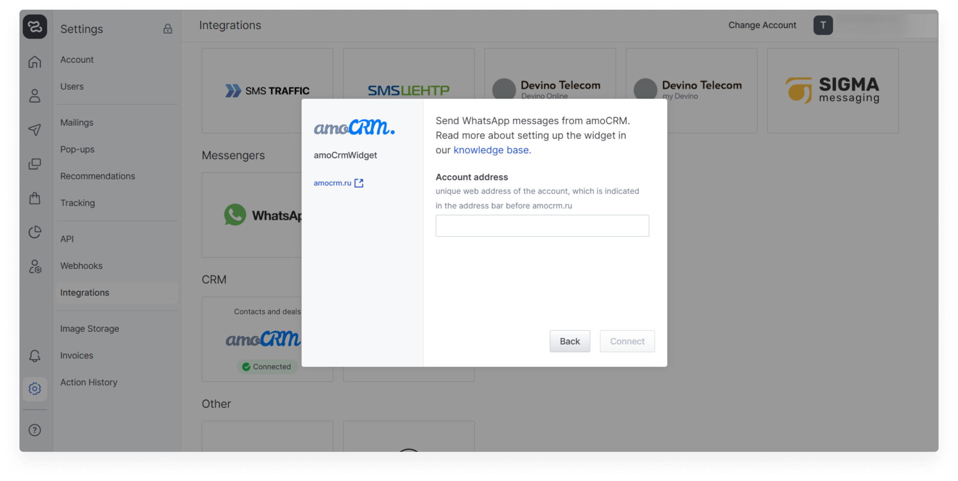 The web address can be obtained from the browser address bar while on your amoCRM account page. For example, if the full address of the page is “https://enkod.amocrm.ru/”, then the web address to be inserted in this window is “enkod”.