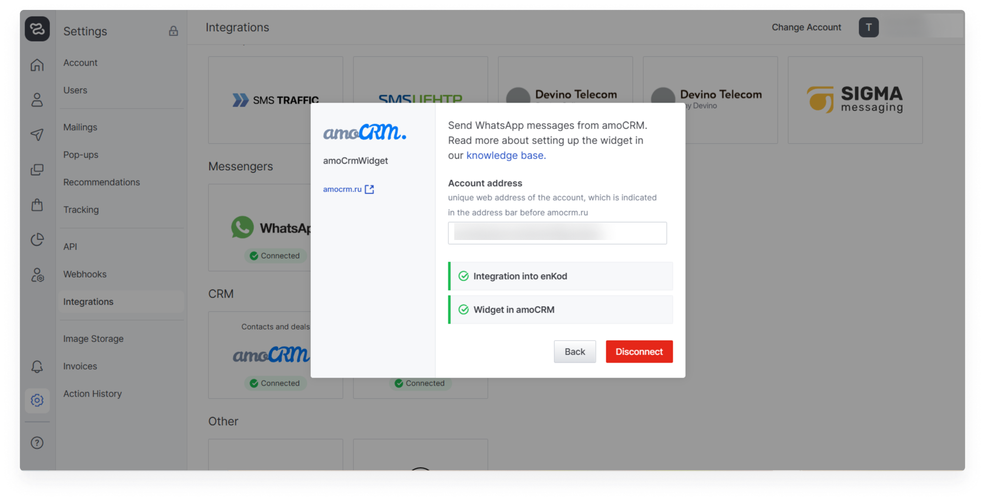 Copy the web address of your account in amoCRM (from the address bar or from the homepage) and go to the Integrations section in enKod. Paste the web address and save your changes.