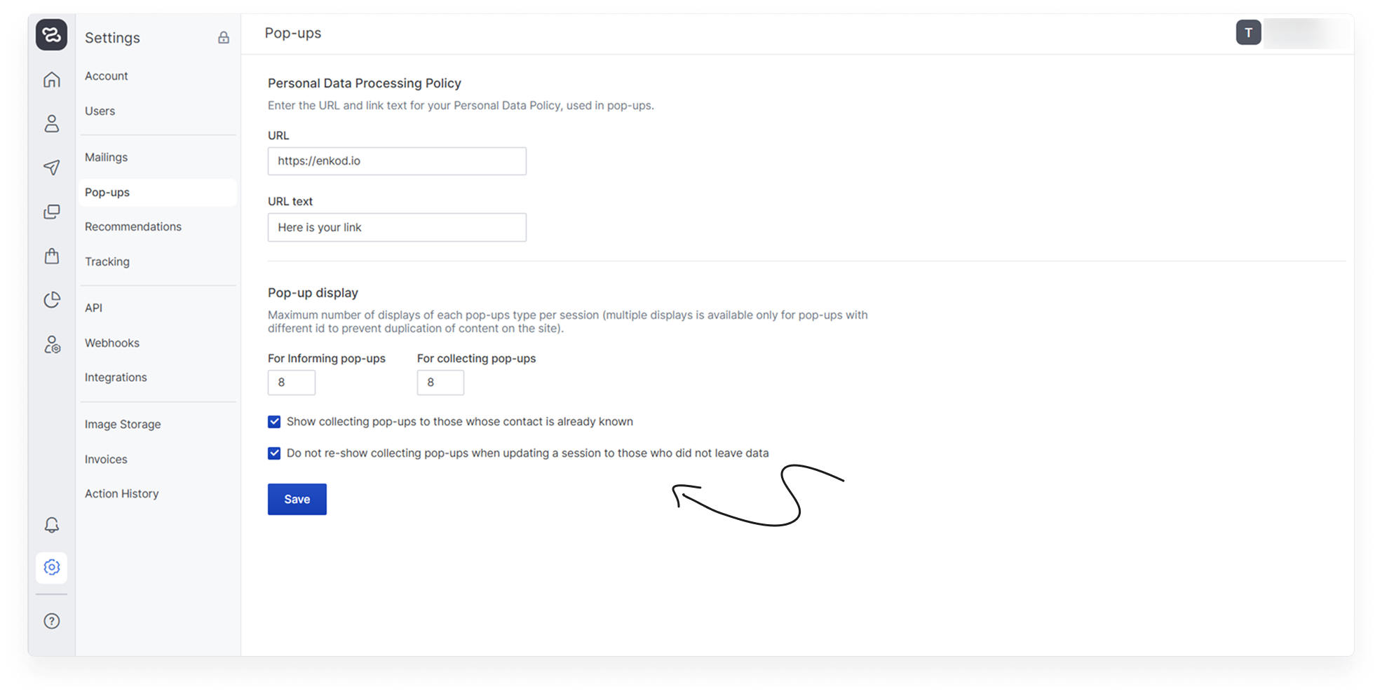 In the settings of the pop-up service, you can set a link to the Personal Data Processing Policy. In this case, when creating a window and selecting the corresponding option, the link will be automatically inserted on popups. To add it, specify: