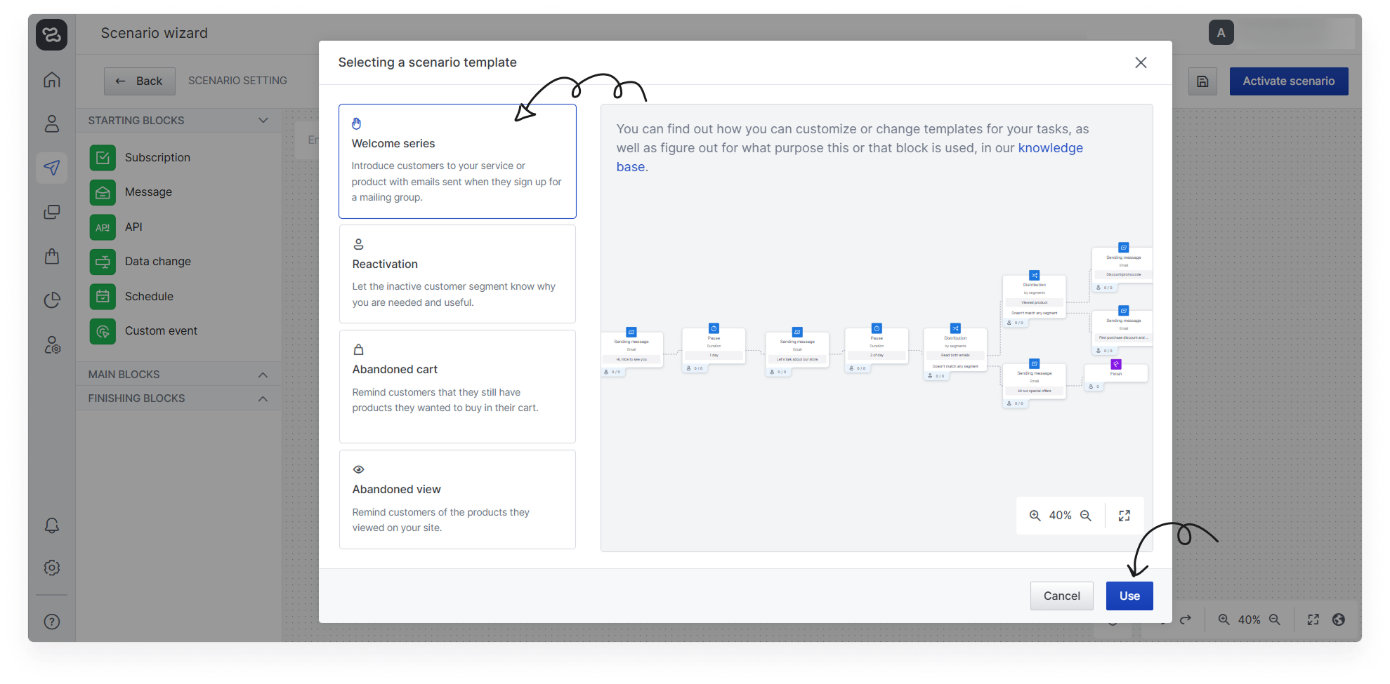 In enKod Mailings ➔ Scenarios ➔ Create a scenario ➔ Use a template (or Create from scratch ➔ Scenario templates) templates are available:
