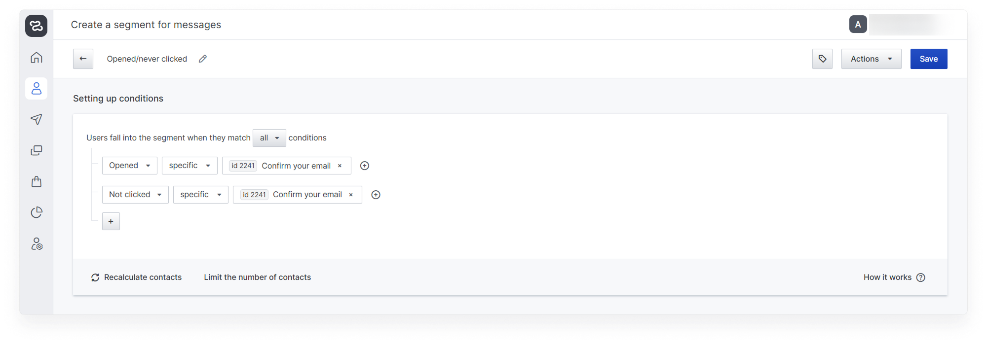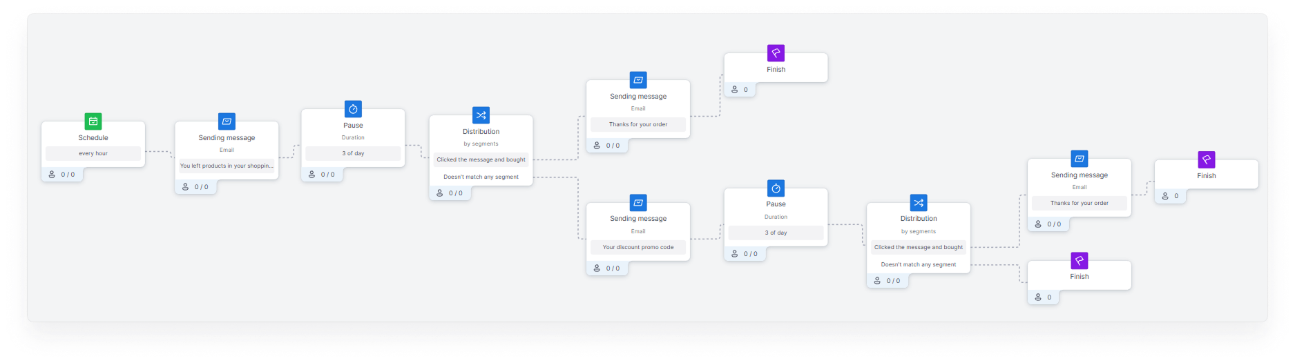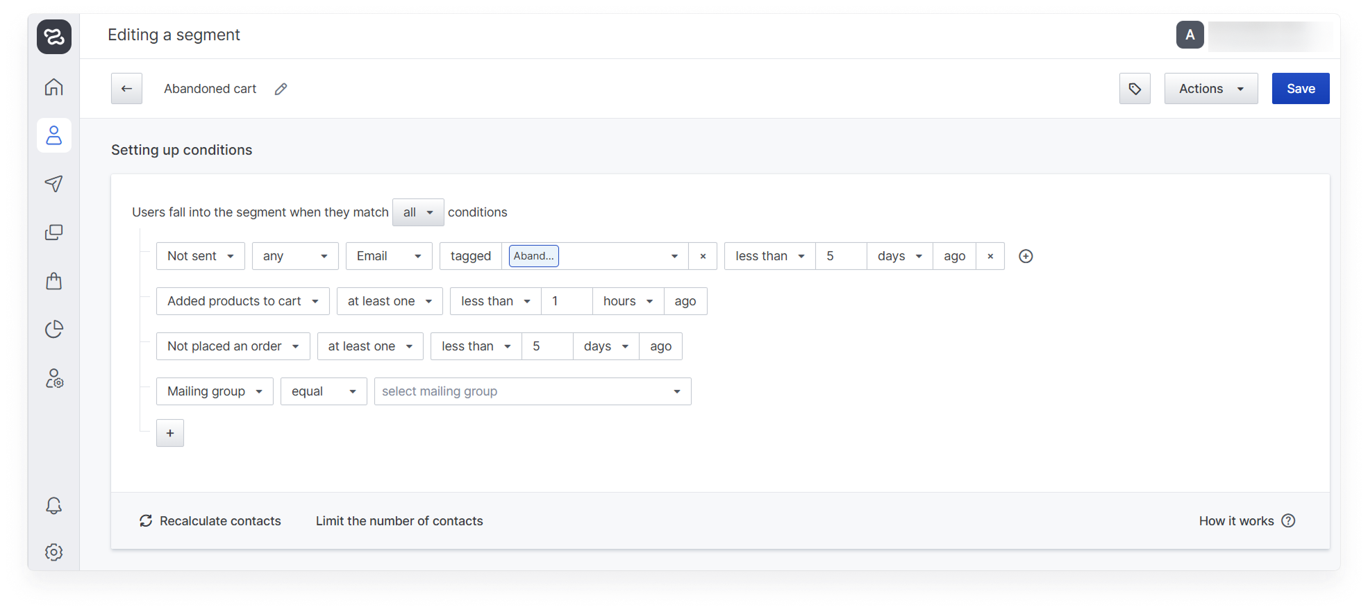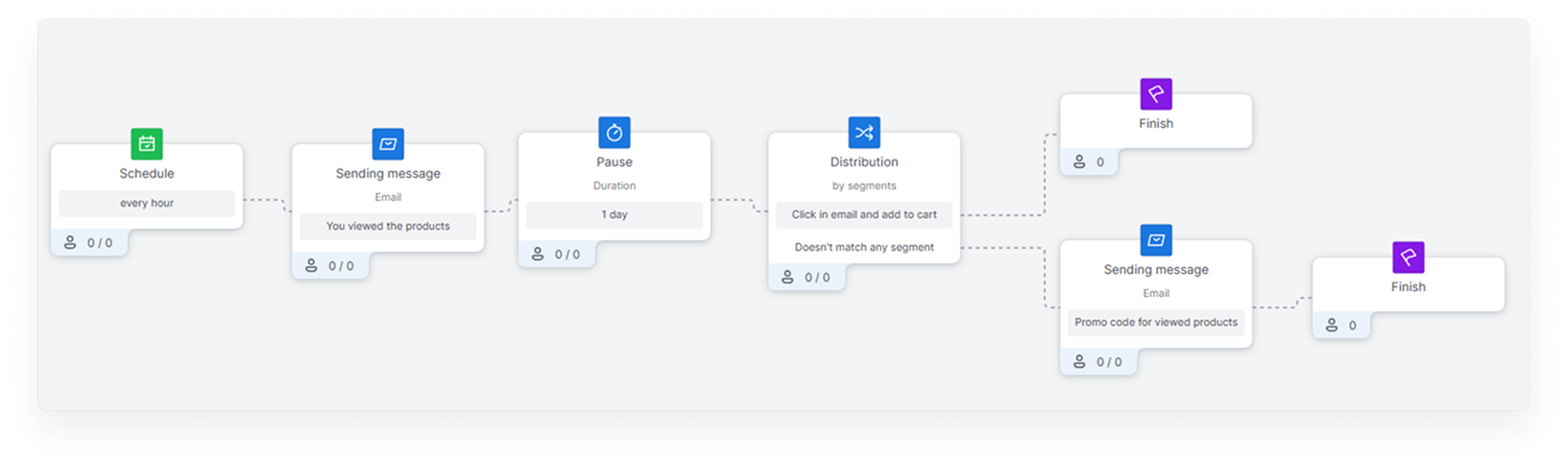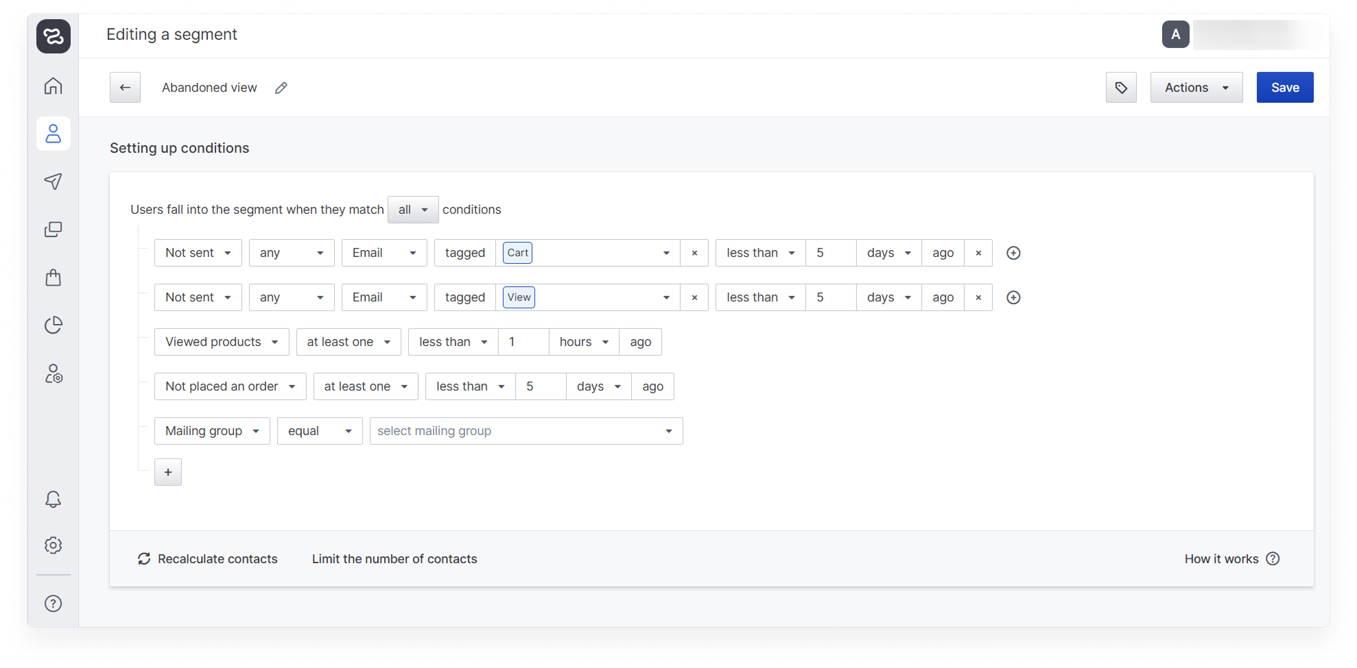 In case a contact falls under the segment conditions of both abandoned cart and abandoned view, it is recommended to send it under the abandoned cart scenario. For this purpose, the above example used the “Not sent any email with an abandoned cart tag less than 5 days ago” restriction, preventing abandoned cart and abandoned view emails from being sent to the same contact at the same time. You can read about how to tag messages and use them for segmentation in the “Message Tags”.
