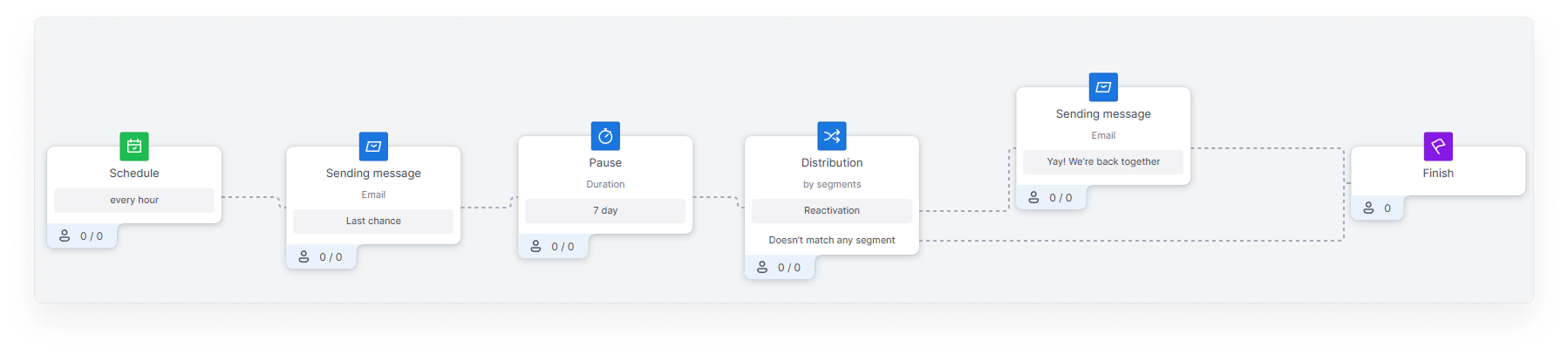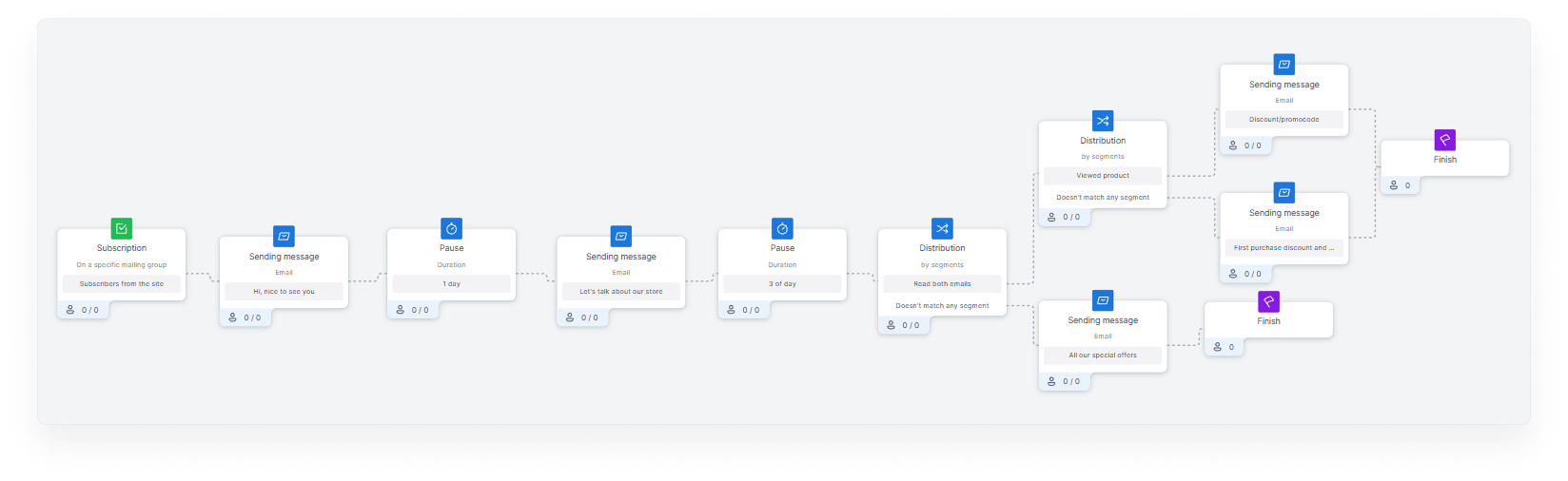 On the principles of working with basic blocks Sending a message, Pause, Distribution in scenario templates you can read in the section above “Welcome Chain”.