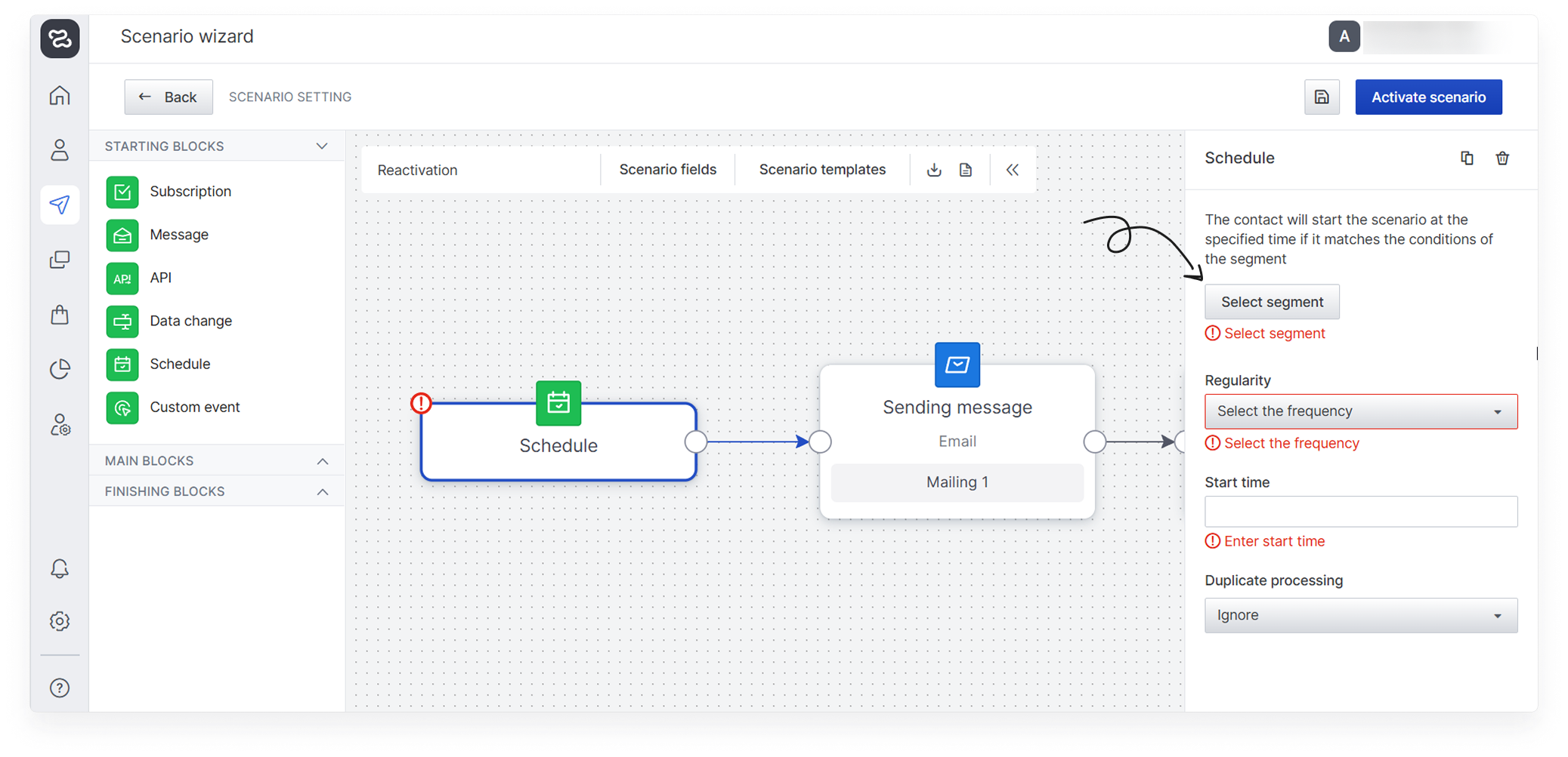 Set the regularity with which the segment will be recalculated: every half hour, hour, day, week, month. And designate a start time for the scenario. You can also control the handling of duplicate contacts, by default they are ignored.