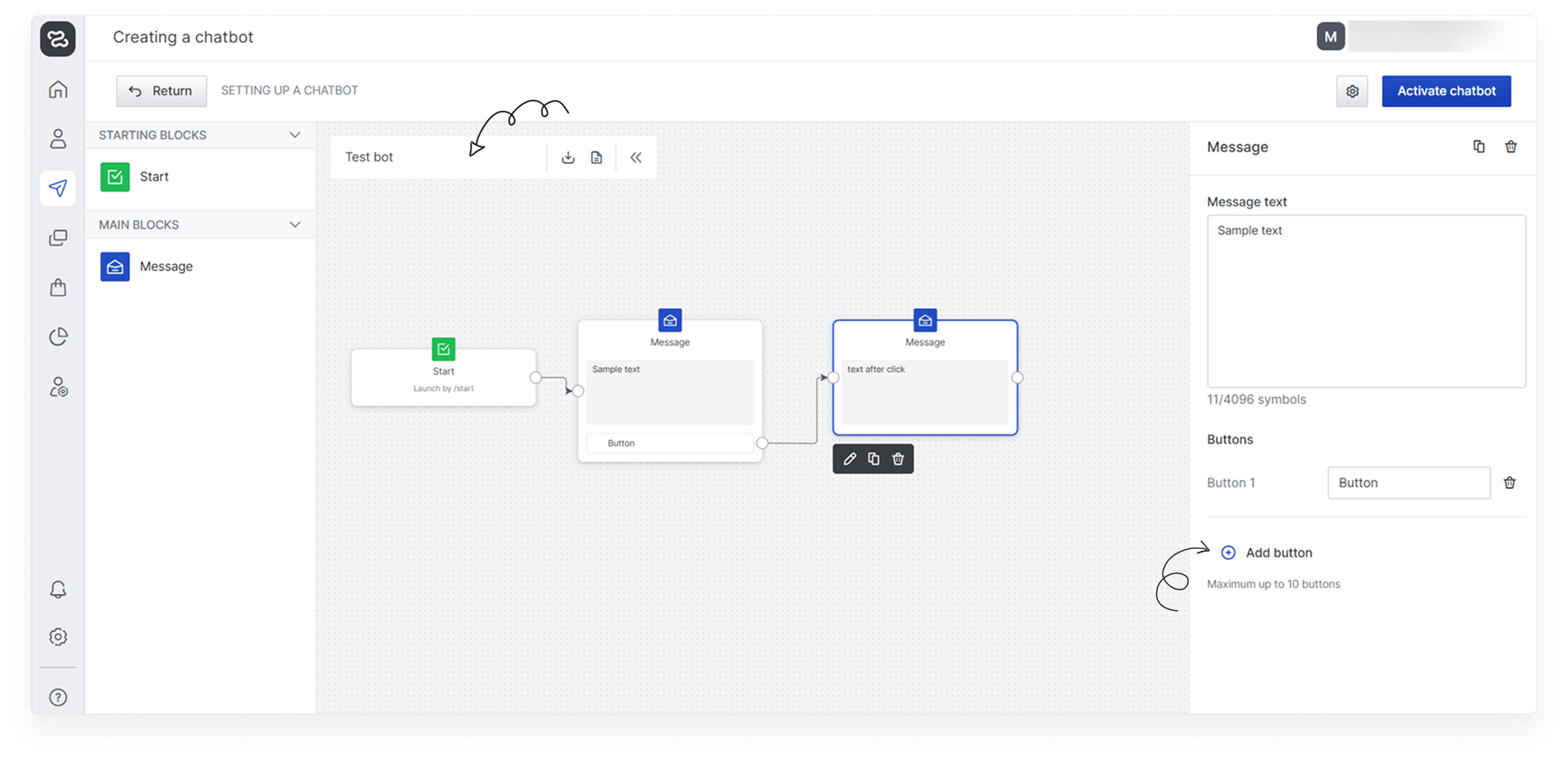 In total you can add up to 10 buttons to 1 “Message” block, buttons of different types can be used in parallel with each other, only the number of “return to the beginning” buttons is limited.