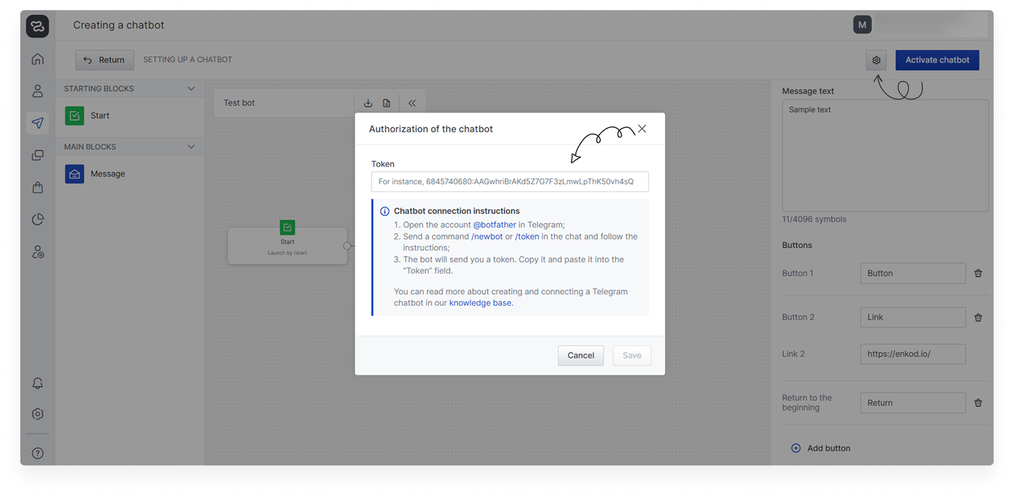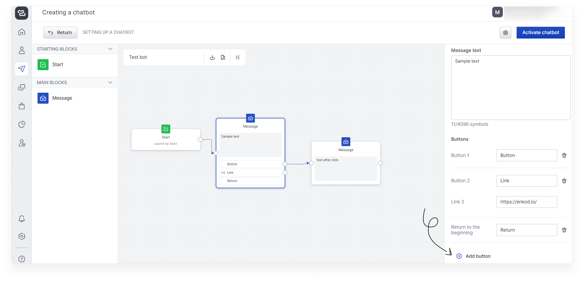 Set a name (it will be displayed only in the enKod interface) and go to the bot editor. Two blocks are available for customization: start and message.