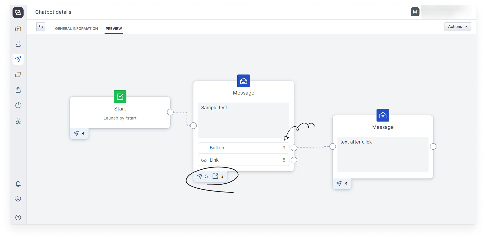 - If a start block is deleted, the statistics under it is deleted. General statistics of bot launches in the “General information” tab is not changed.