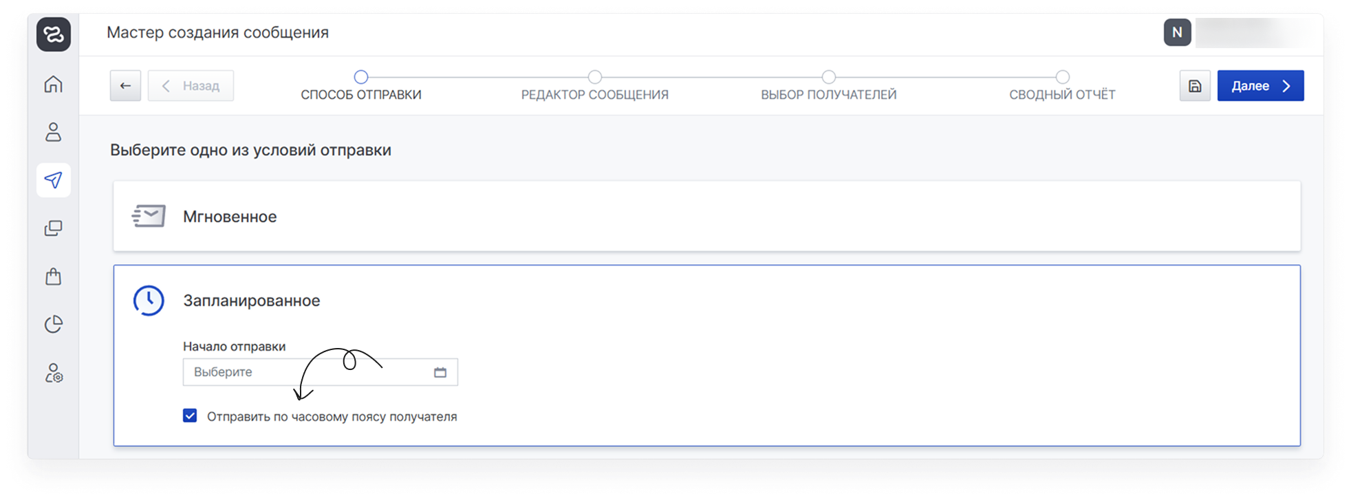 | Время запуска настроено так, что часть получателей с их часовыми поясами уже пропустили настроенное время | Сообщение им будет отправлено в настроенное время по часовому поясу аккаунта |