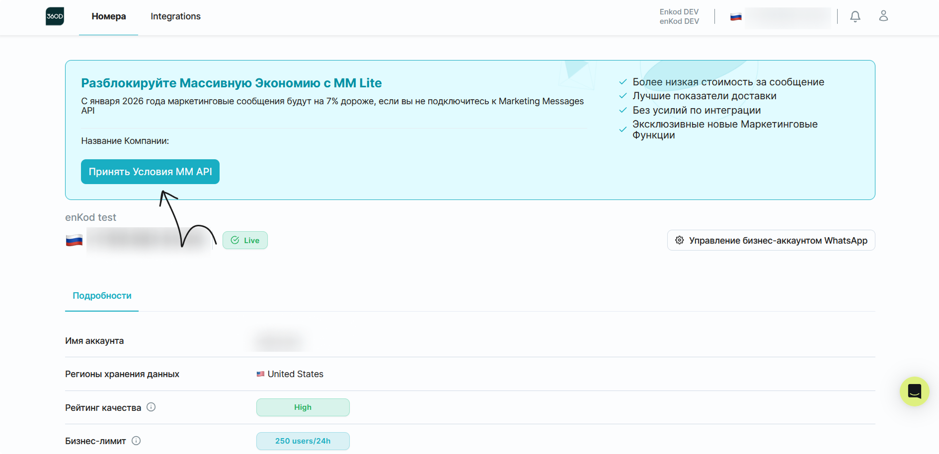 Чтобы избежать переплат и улучшить условия рассылки - перейдите в ваш личный кабиент 360dialog и пройдите онбординг по кнопке «Принять условия MM API».