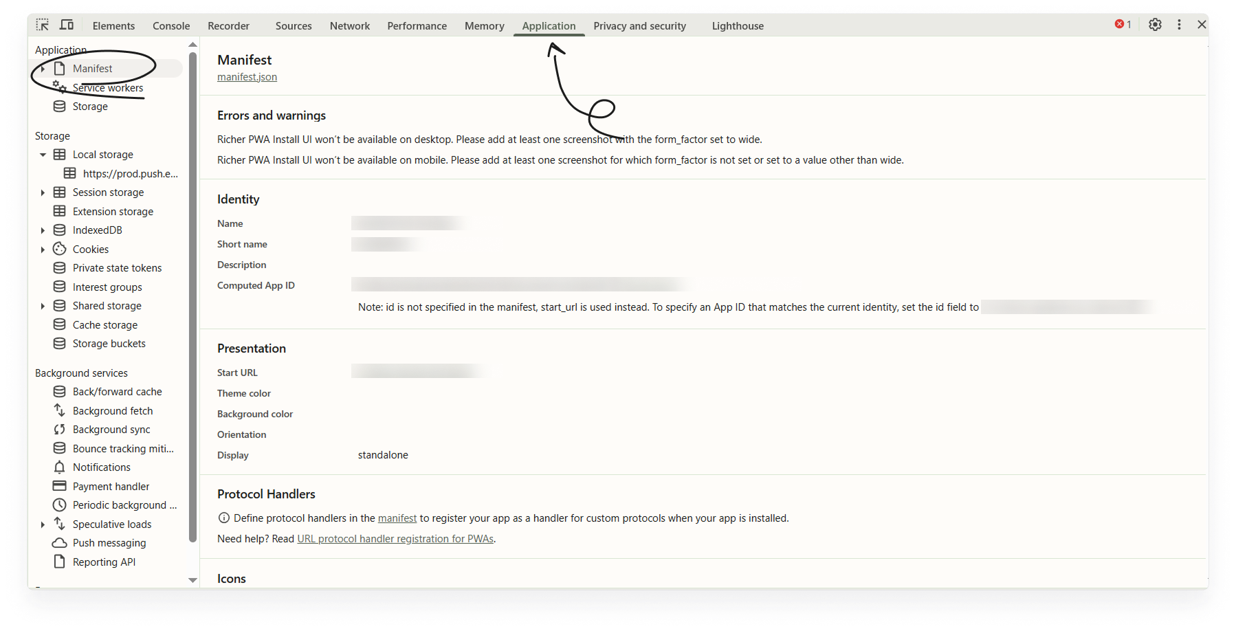 - В корне сайта необходимо разместить файл manifest.json. В файле множество параметров, каждый из которых индивидуален для проекта и должен быть корректно настроен (например иконка или название сайта). Если файл настроен и размещен верно, то в консоли разработчика вы сможете увидеть информацию о нем и проверить отсутствие ошибок