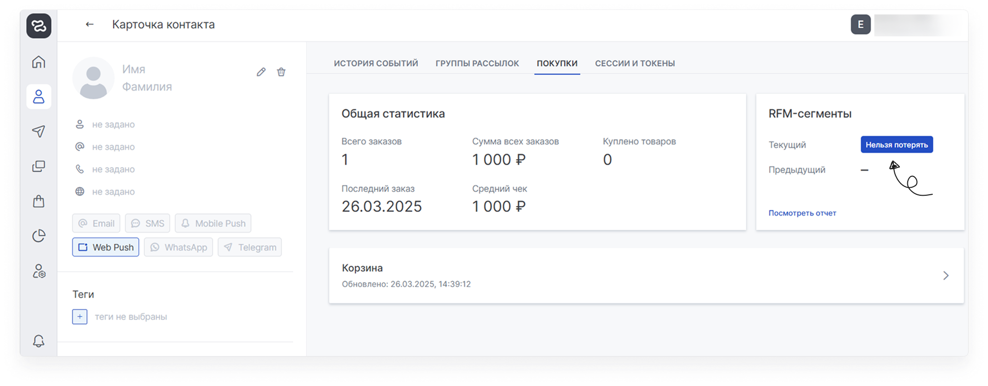 Присвоенный контакту сегмент (текущий и предыдущий) можно увидеть в Карточке контакта ➔ Информация о покупках ➔ RFM-сегменты: