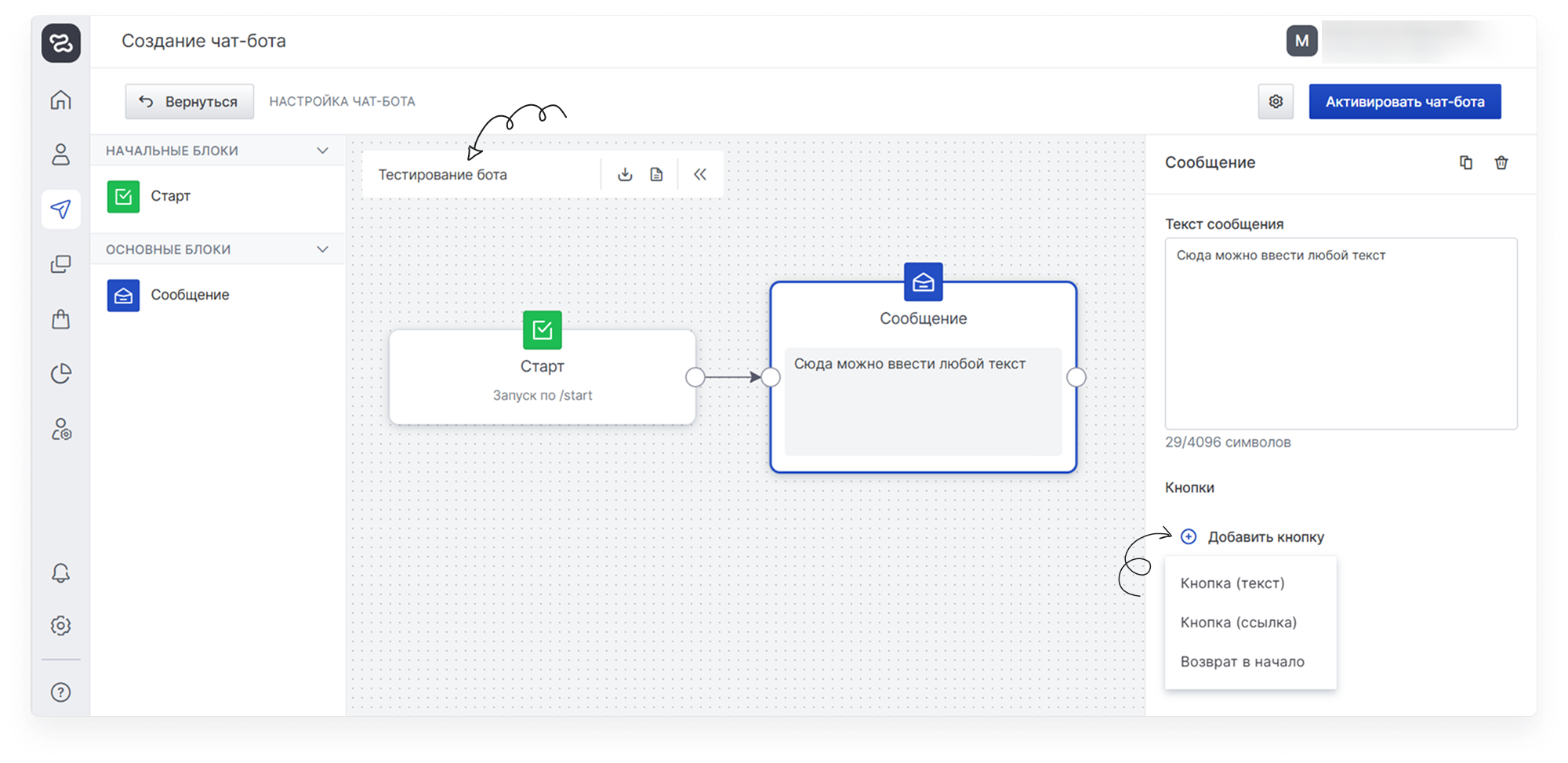 Активного бота можно редактировать (название, контент блоков (кнопки, тексты), их порядок, добавлять новые блоки, удалять блоки), но запрещено менять токен в окне авторизации. При редактировании активного бота он продолжает работать по сценарию. Изменение токена бота доступно только для неактивного статуса.