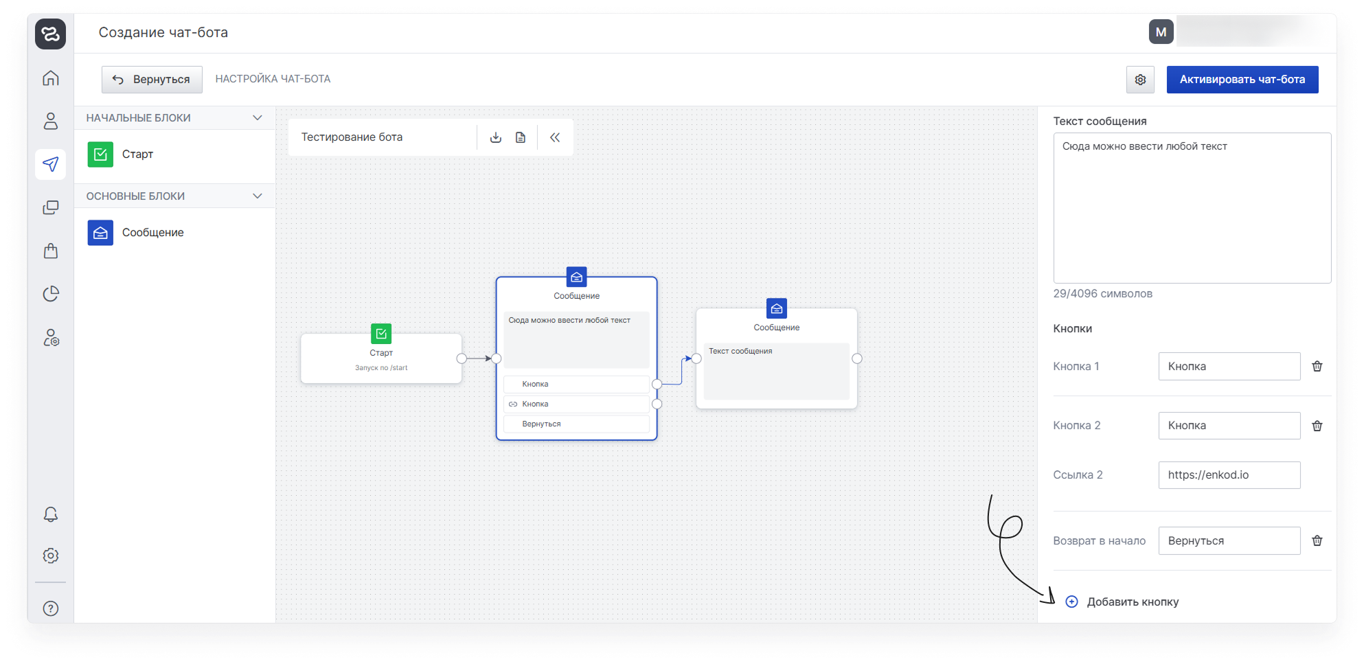 Задайте название (оно будет отображаться только в интерфейсе enKod) и перейдите в редактор бота. Для настройки доступно два блока: старт и сообщение.