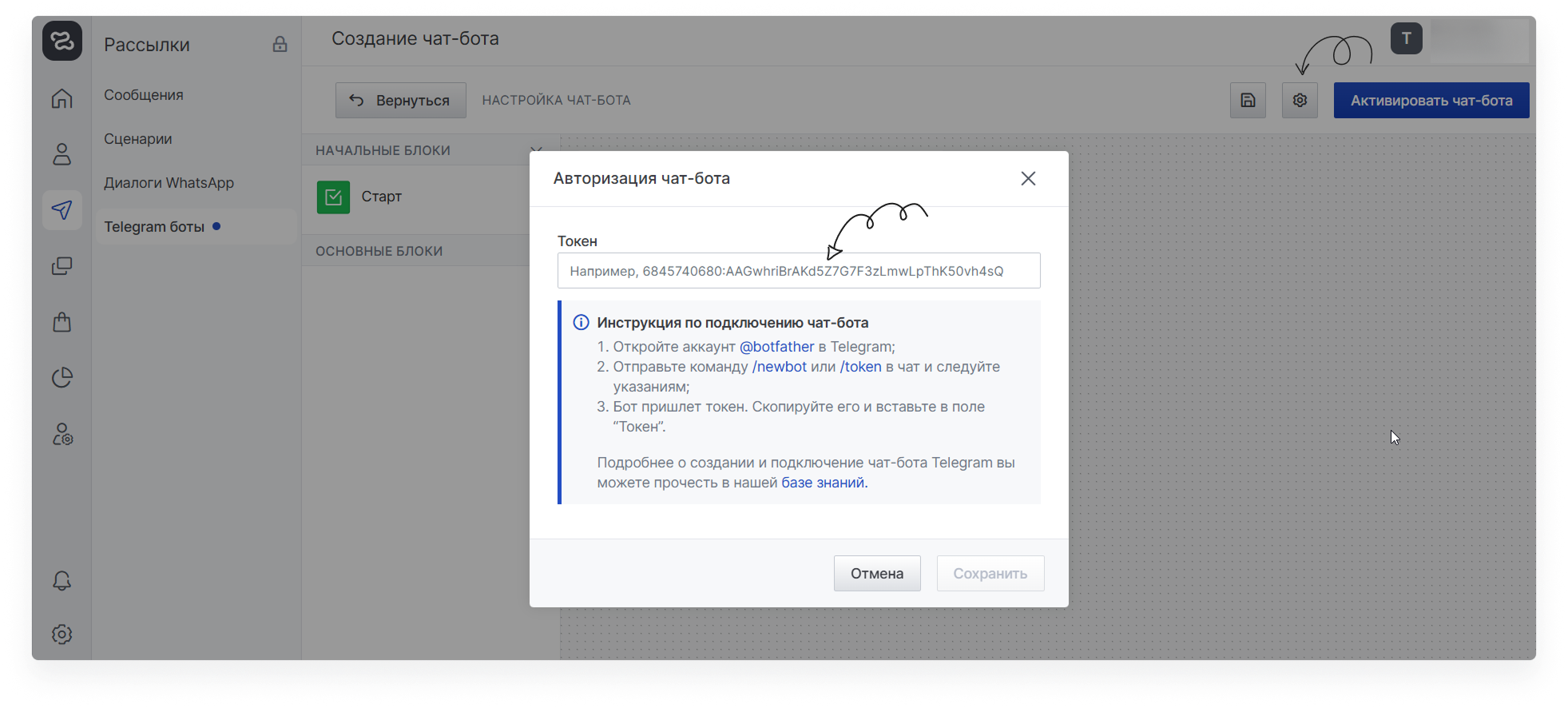 При активации бота, если все проверки будут пройдены успешно, система запросит у вас токен бота, который был получен из @botfather. Вставьте токен во всплывающее окно и запустите бота.