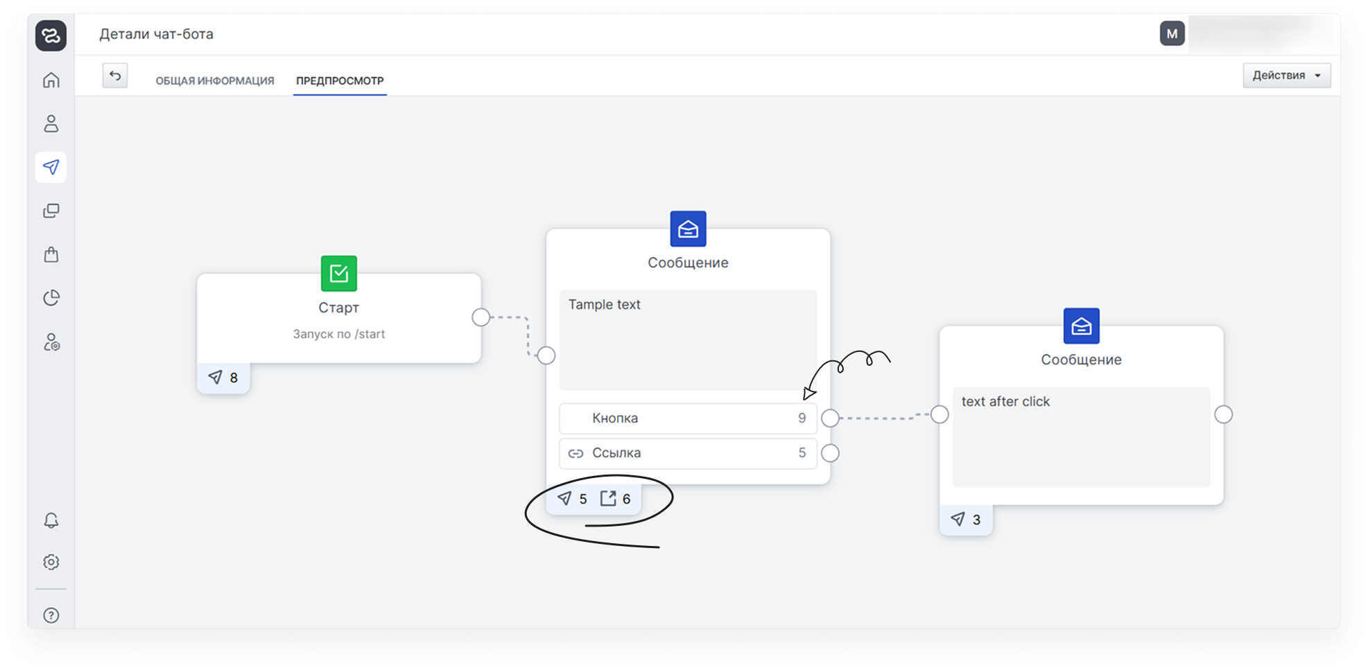 - При удалении стартового блока статистика под ним удаляется. Общая статистика запусков бота в табе «Общая информация» не меняется.